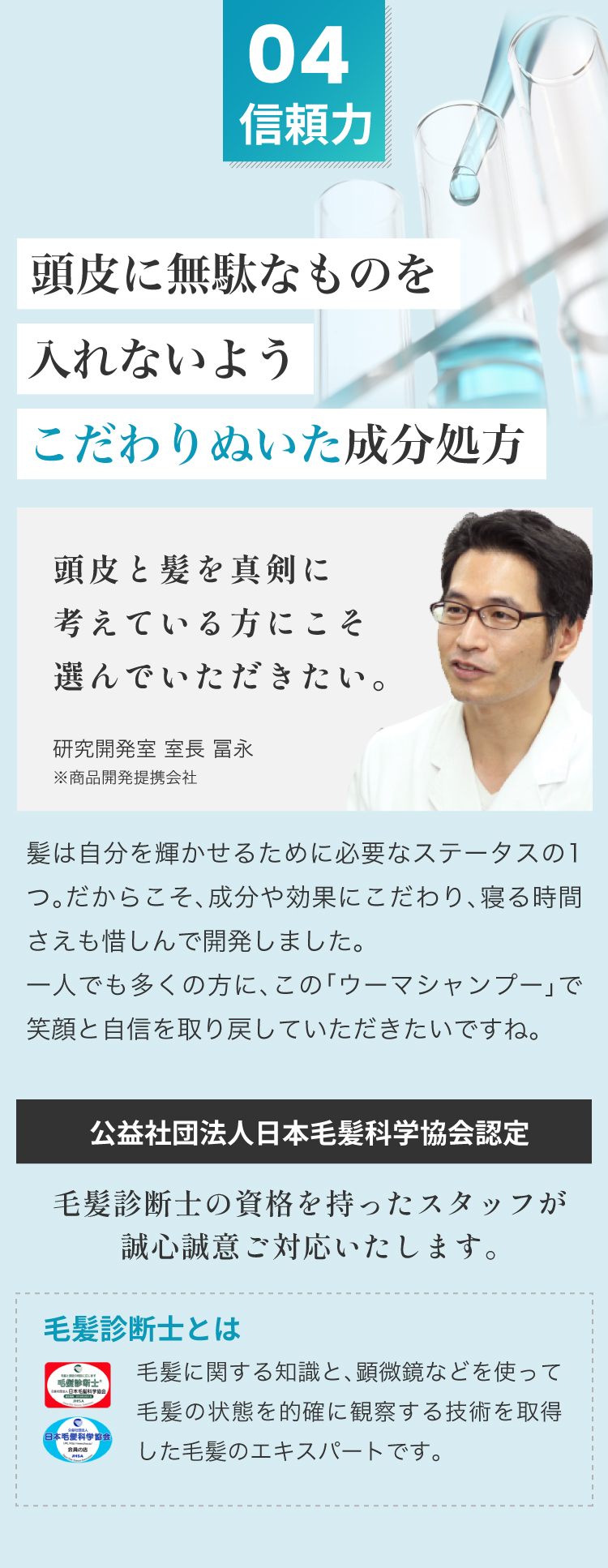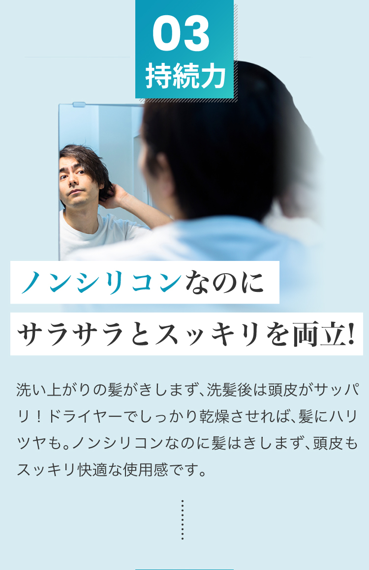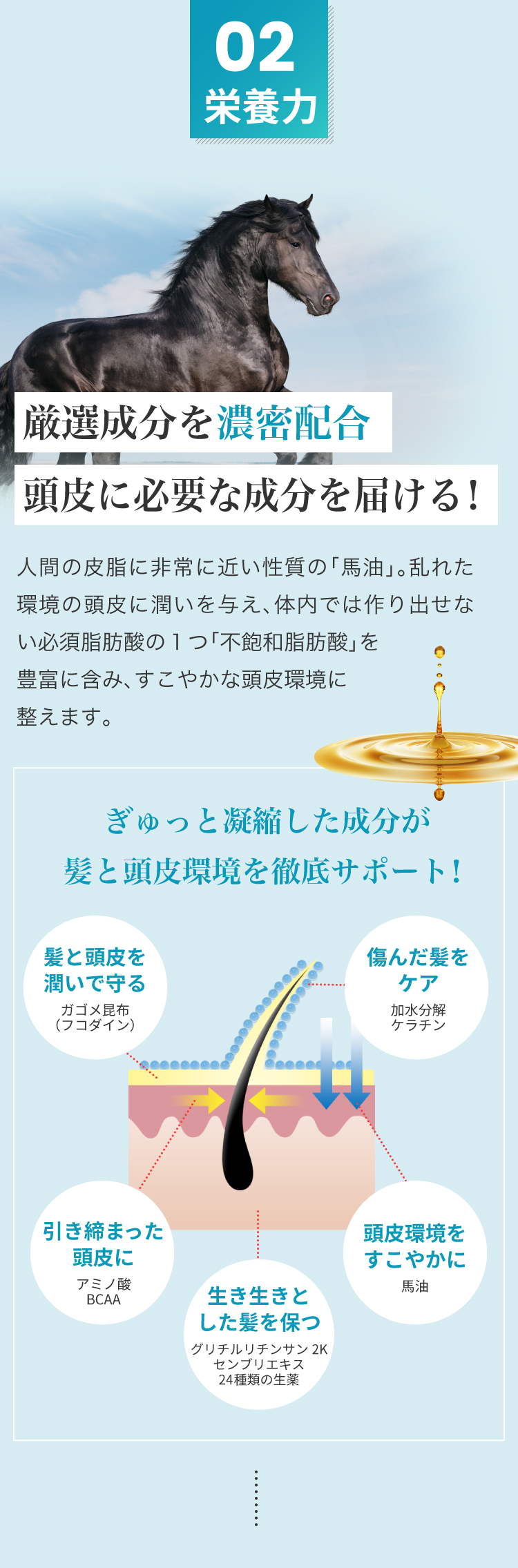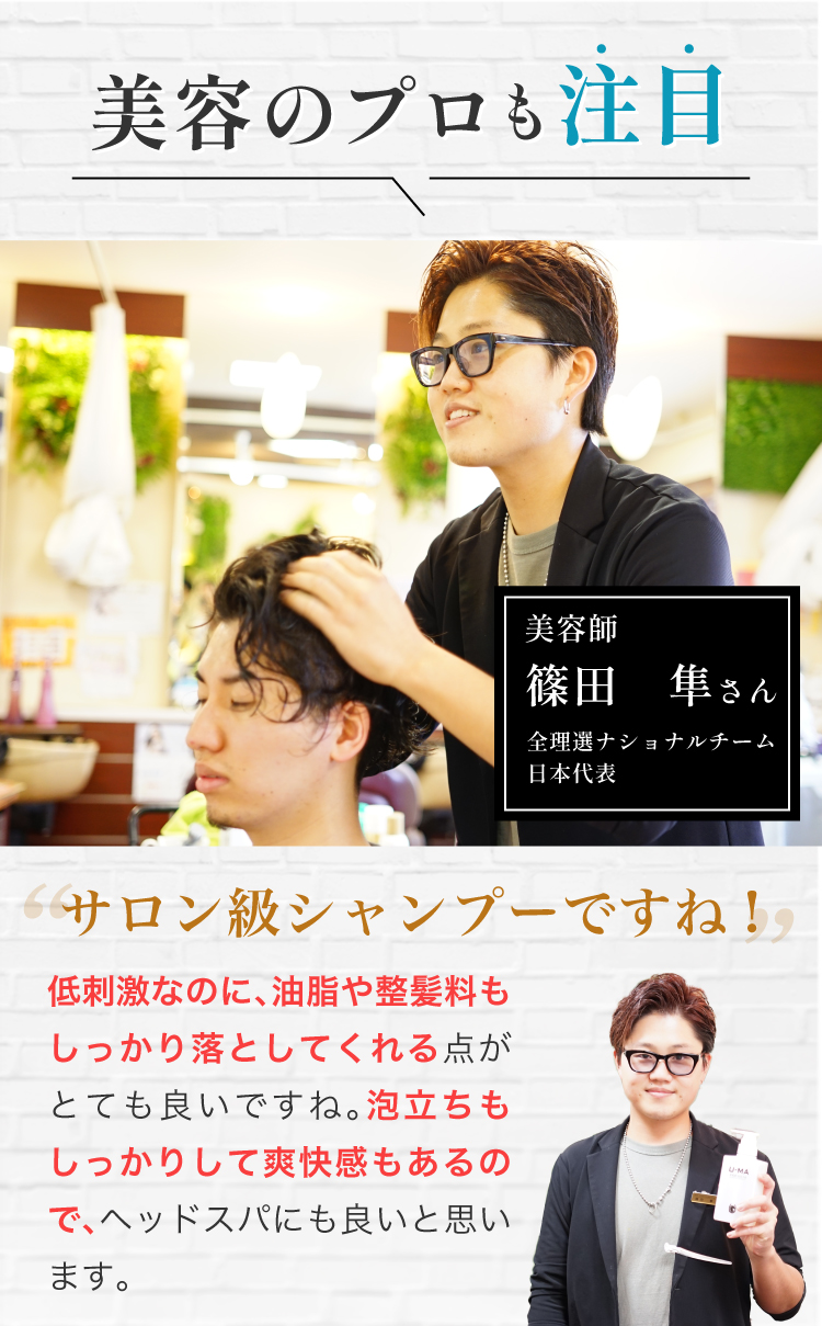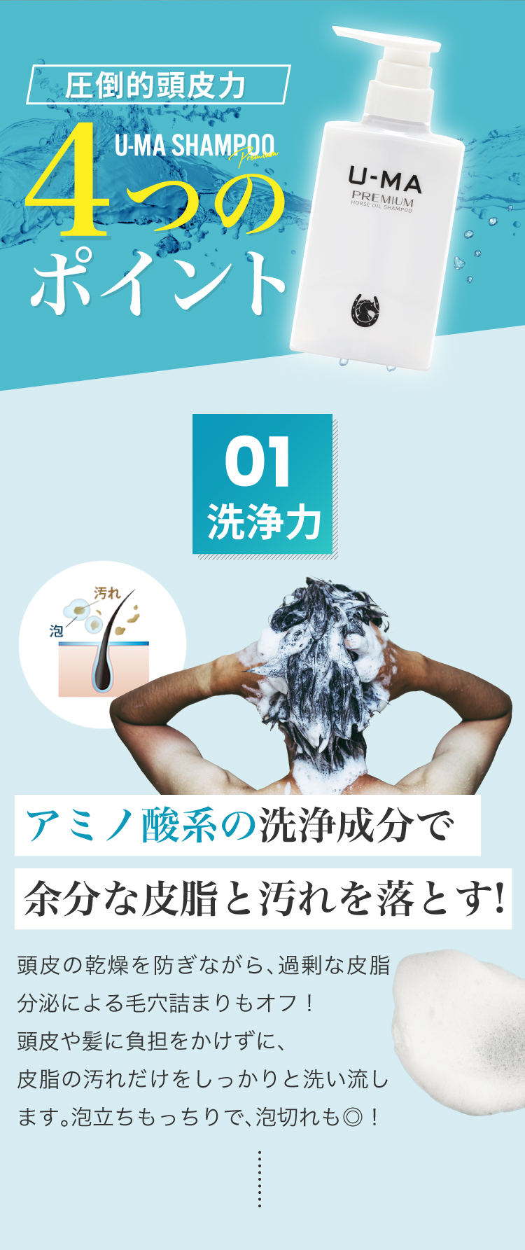 植物由来アミノ酸系洗浄成分と高品質「馬油」で頭皮環境を整えます。さらに整えた頭皮に、栄養を与え、根本から強くハリ・ツヤ・コシを与えます。敏感肌にも安心。男女兼用にてご使用可能です。